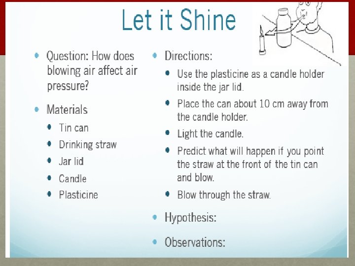 Hypothesis • What is a hypothesis? • I think that if we blow air towards the candle will ______(stay lit or go out) because____________.