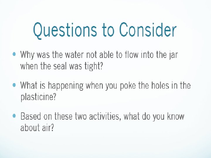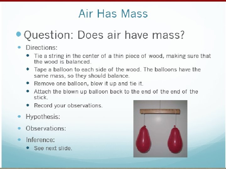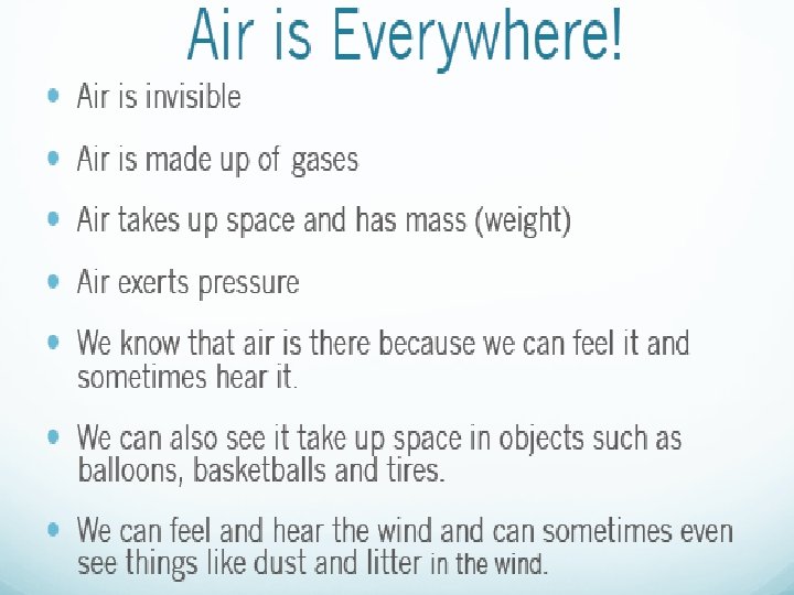 AIR TAKES UP SPACE • Think of Basketballs, footballs, rugby balls, and balloons. Air takes up space giving these objects shape. • Usually you can tell how much space air is taking up by the shape of an object. Example: blowing up a balloon, the space air is taking up changes as the balloon expands. • Experiment: Air is everywhere.