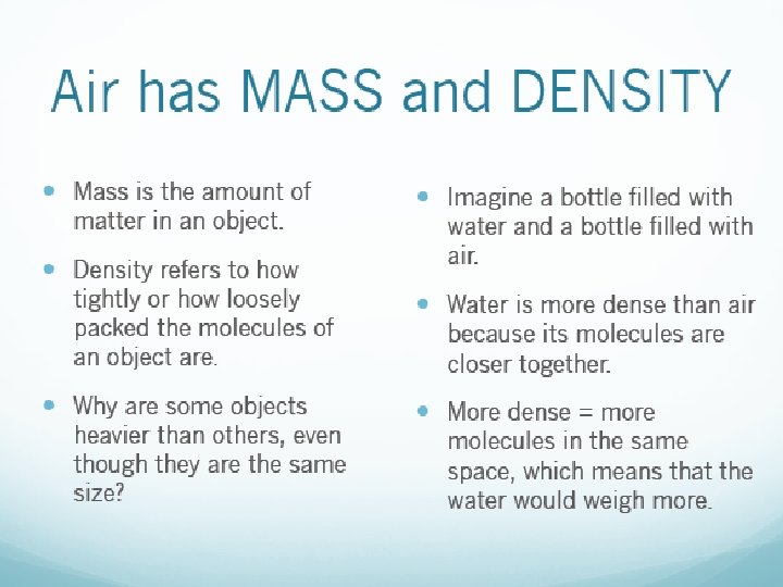 Air is so Massive and Dense (Mass and Density) • Mass refers to the amount of matter in an object • Density refers to how tightly or how loosely packed the molecules of an object are. • Density= mass/volume • Take two bottles of the exact same size. One is filled with water and the other with air. We know that the bottle filled with air is heavier, that is because water is more dense then air. Water’s molecules are closer together than air’s. • Two balloons are attached to a straw, one at each end. One is filled with air the other is not. What would happen to the straw? Which balloon would be heavier? • What happens to air at sea level? How much pressure is air exerting? What about at the top of a mountain? How much pressure is air exerting there?
