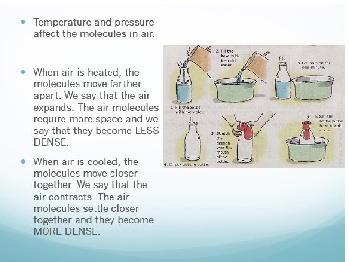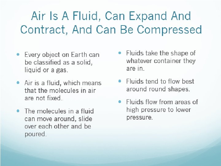 Air is a Fluid • Air can expand, contract, or be compressed. • Air is a fluid. Fluids are gases or liquids. • The molecules in fluids are not fixed (they can MOVE AROUND and SLIDE PAST EACH OTHER) • Fluids take the shape of whatever the a poured/put in to. • Fluids flow from areas of high pressure to areas of low pressure. • Pressure or temperature changes in fluids lead to density changes • The warmer it is the further apart the molecules get (expand) making air less dense, the colder it gets the closer the molecules (contract) the more dense air becomes