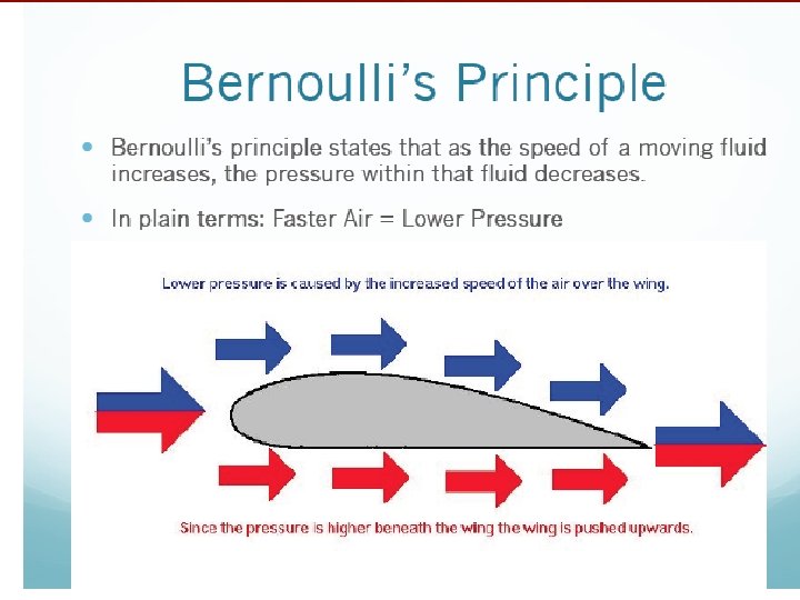 BERnoulli’s principle • AS THE SPEED OF A MOVING FLUID INCREASES THE PRESSURE WITHIN THE FLUID DECREASES • The wing of an airplane is shaped like an airfoil. It is designed like this so that air flows over the top of the wing faster than it flows under the wing. • Air pressure on the top of the wing would be lower and under the wing would be significantly higher causing a push on the wing upwards…CREATING LIFT!