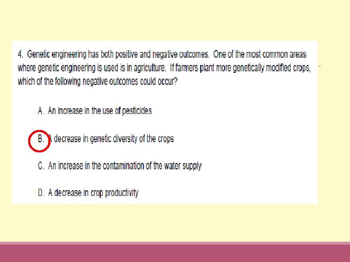 Genetically Modified Organisms Examples: Animals ◦ Bacteria can “eat” oil and radioactive wastes ◦ Extra growth hormone genes to grow faster Plants ◦ Disease & insect resistance ◦ More nutritional value ◦ Bigger, tastier fruits & veggies