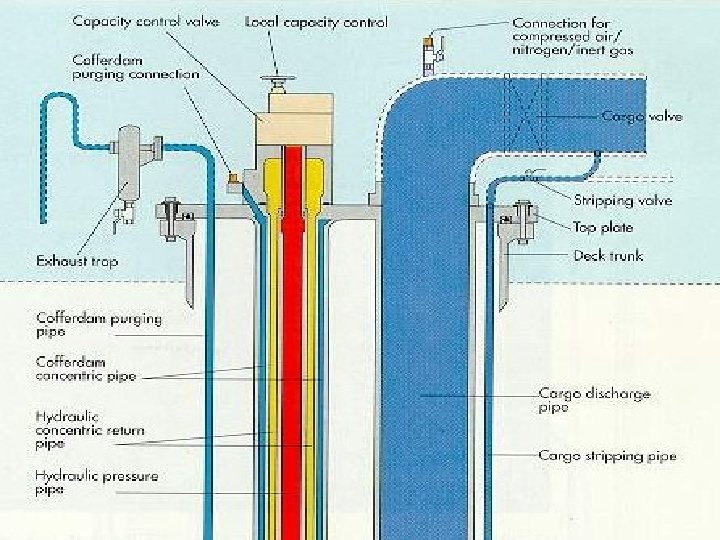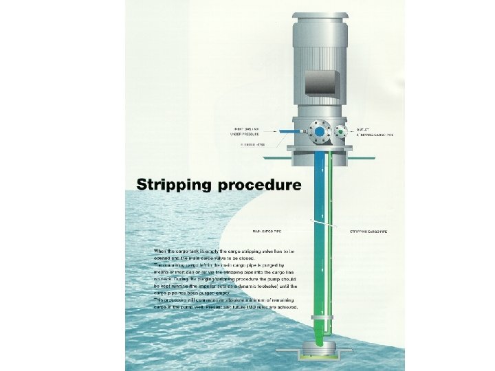 Stripping Procedure • When the cargo tank is empty, the cargo stripping pump valve has to be opened and the main cargo valve to be closed. • The running cargo left is purged by means of inert gas or air via the stripping line pipe into the cargo line on deck. • During purging/stripping procedure, the pump should be kept running ( the impeller acts as a dynamic foot valve) until the cargo pipe has purged empty • This procedure will generate an absolute minimum of the remaining cargo in the pump well