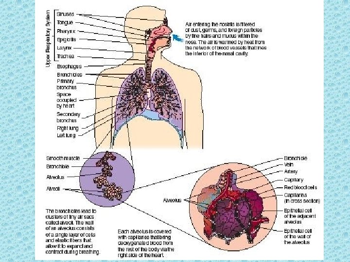 Alveoli reminder— this is where the action is! Key to lung function Where O 2 enters blood, CO 2 leaves blood Every alveoli is capillary covered sac Lining of sac is squamous epithelium Also cuboidal epithelial cells that secret surfactant (keeps surfaces from sticking) and cilia (to move mucous and particles up respiratory tree • Unfold alveolar membranes in human lungs—tennis court! • • • But how does air get to alveoli?