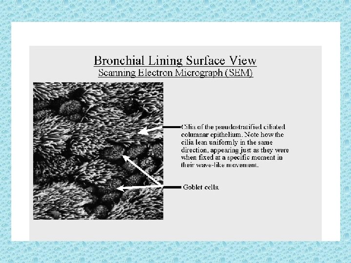 Respiratory epithelium • Bronchii lined by ciliated, pseudostratified epithelium • Goblet cells and glands secrete mucous • Cilia move in waves and mucous, along with particles are swept towards pharynx—”mucous escalator”