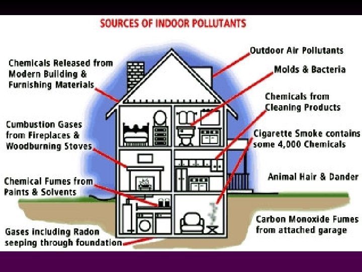Biological Pollutants • • Bacteria and fungal spores can enter structures via air handling systems and occasionally cause disease outbreaks (Legionnaires’ Disease episode in Philadelphia in 1976). Many allergies are associated with exposure to household dust which may contain fungal spores, bacteria, animal dander, and feces of roaches or mites.