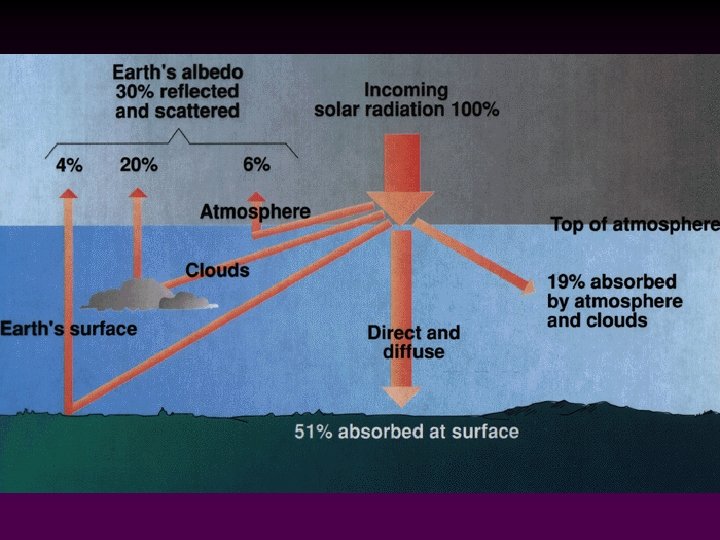 Incoming solar radiation may be: Scattered and reflected due to contact with dust particles and clouds -> some is reradiated to outer space; some to the Earth's surface v Absorbed by dust, carbon dioxide, water vapor in the atmosphere v Reflected from the ground v Absorbed by the ground v