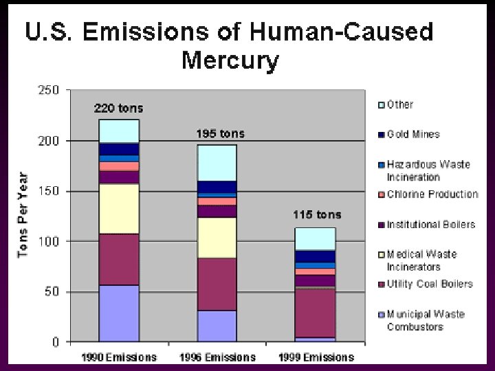 Environmental Effects of Acid Deposition: Mobilization of toxic metals • As p. H decreases, toxic metals (Al, Mn, Pb, Zn, Hg, and Cd) dissolve out of bottom sediments or soils and leach into the aquatic environment. These metals can: v v • bioaccumulate in fish tissues, making them dangerous for humans to eat can kill fish by damaging their gills (especially aluminum) Acidification cause the conversion of moderately toxic inorganic mercury Hg to the highly toxic organic methylmercury
