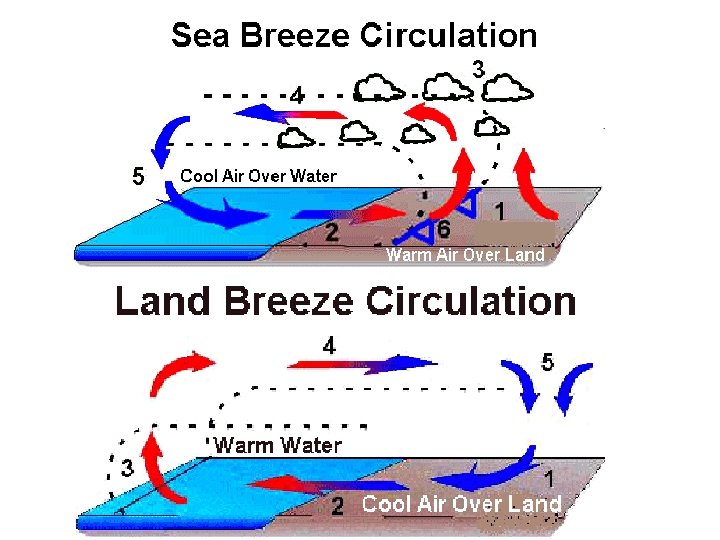 Valley Breeze: Flow of warm air up the mountainside during the day Mountain Breeze: Flow of cool air down the mountainside at night