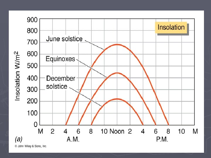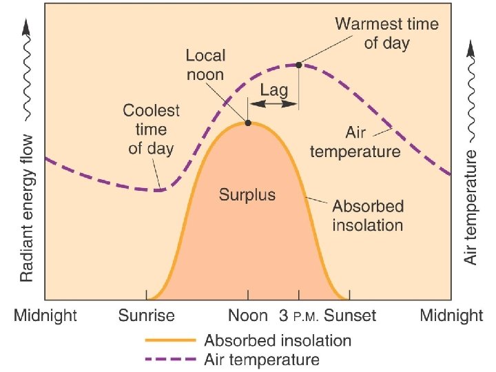 ►lag between max insolation and max temperature § because highest temp at time of max ABSORBED insolation
