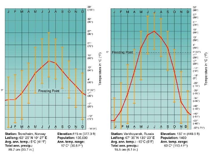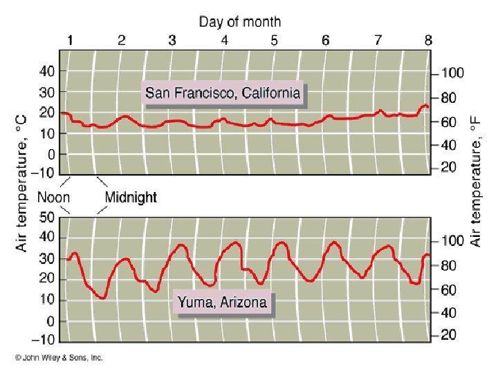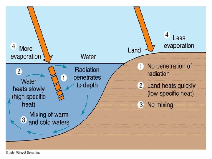 ► “Land heats up and cools down more rapidly than water. ” § Therefore: ►Coastal: smaller temperature ranges than continental locations. ►Coastal locations have their maximum temperatures well after maximum insolation.