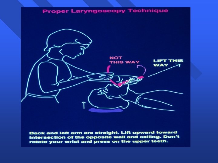 Teeth Look for § § Loose teeth Dentures, missing teeth – document Mal alignment Buck teeth Dental injury is GRIEVIOUS so avoid it during laryngoscopy