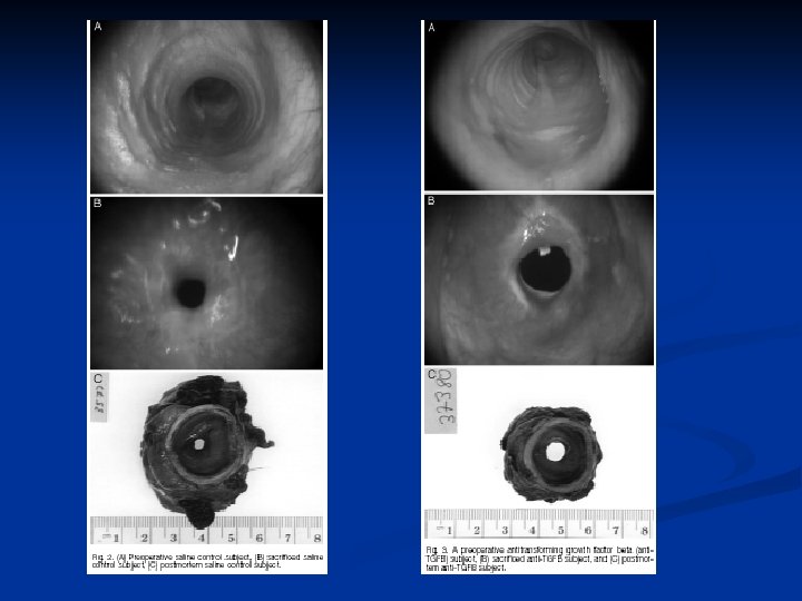 TGF-β: GF secreted by fibroblasts, macrophages and platelets n Implicated in scarring in many different organ systems and in animal models n Biopsy specimens of IPSS and intubation related stenosis patients show high levels of TGF-β-2 n IV and local injection of an antibody available n Used to treat fibrosis in skin, ureters, kidney and eye n Recent study showed inhibition of scarring in rat trachea with continuous infusion of anti-TGFβ n
