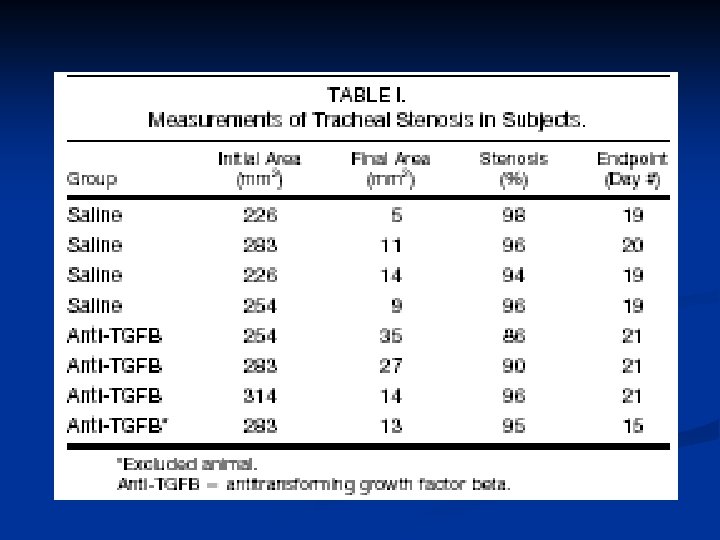 TGF-β n Conclusions: IV and local TGFβ injection resulted in a reduction in tracheal stenosis (p <. 05) and an increase in survival time (p <. 03) when compared to saline control subjects n Anti-TGFβ appears to be useful adjunct in treatment of LTS n Further study needed to determine optimal dosing, route of administration and timing of delivery n
