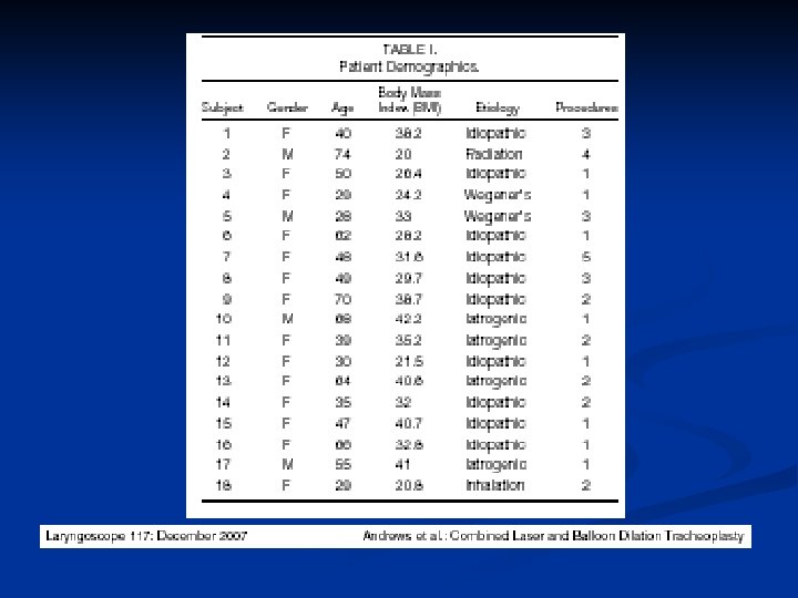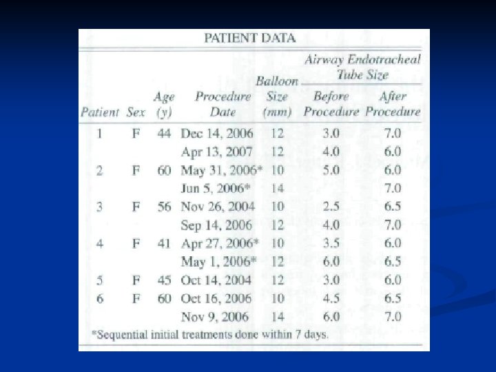Combined Laser & Balloon Dilation n Andrews et al (2007) Performed flexible bronchoscopy for combined Nd: YAG laser radial incision at site of stenosis and balloon dilation in awake, spontaneously breathing patients Total of 18 patients underwent 36 procedures n n 8 pts required only 1 procedure; 5 pts required 2 procedures (72%) 11/18 patients (60%) were obese or morbidly obese Average f/u 22 mos; avg time b/w procedures 9 mos No complication in study group