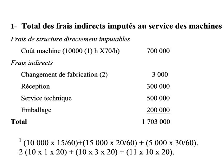 Calcul du coût de l’utilisation des machines • On part de la production réalisée : exemple pour le produit A 10 000 unités – On note la consommation d’heures machine pour cette production 15 minutes par unité – On valorise : 10 000*15/60*70 • On effectue le même calcul pour les produits B et C