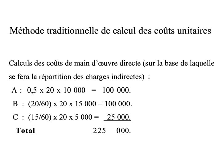 Ce qui donne la clé de répartition suivante • Pour chacun des produits – Clé répartition A : 100 000/225 000 = 0, 444444 – Idem B – Clé répartition C : 25 000/225 000 = 0, 111111 • Calcul des coûts selon la méthode traditionnelle : regroupement sur un tableau unique