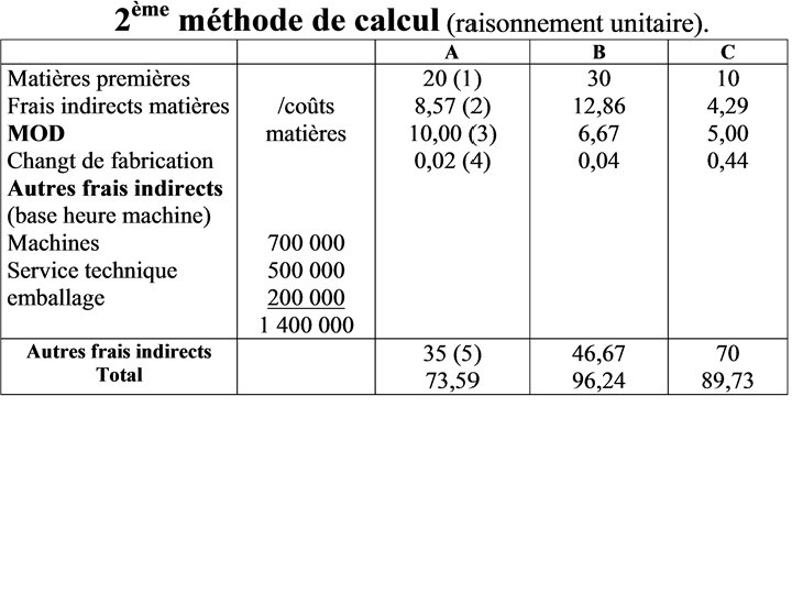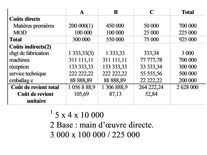 Ce qui donnera la répartition suivante : exemple un produit A Coûts directs de production Composants Frais réception matières MOD MO changement de machines Coûts indirects de production Machines Technique Emballage Nouveau coût de revient A Composants consommés = 5 * 4$ = Sur la base des MP consommées = Heures travaillées = 30/60*20 = 10*20* (1/1000) = 175/700 * 1 400 000 = 35 000 À l’unité cela donne 35 000/10 000 soit 20 8, 57 10 0, 02 35 73, 59