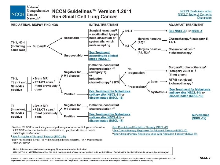 Lung Case # 2 Clinical Staging • Rationale for staging choices – T 2 b for ca >5 cm but <7 cm – N 2 because ipsilateral mediastinal nodes were clinically positive on imaging, and the diagnostic biopsy confirms the clinical category of N 2 (per new rules in AJCC 7 th) – M 0 because there was nothing to suggest distant metastases; if there was, appropriate tests would be performed before developing a treatment plan