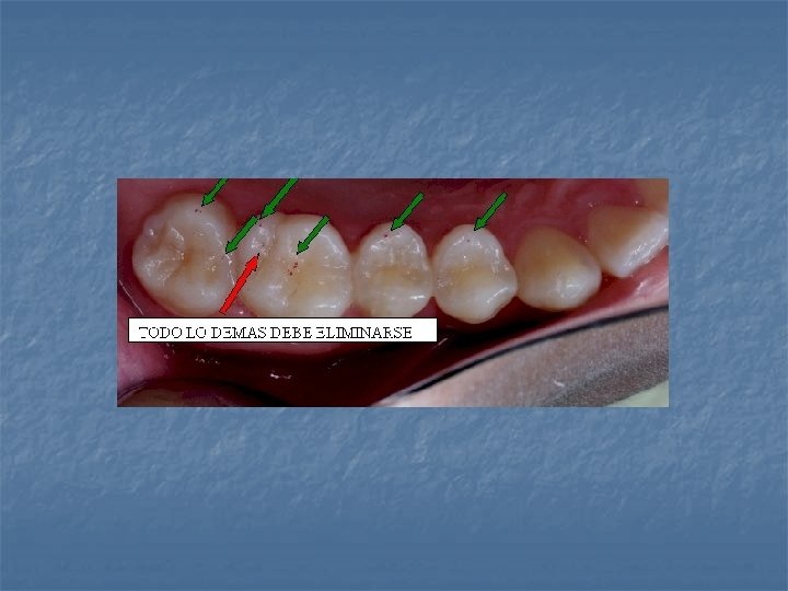 Procedimiento: n n Reducción por desgaste fino cada punto de contacto. Primero superior, luego inferior. Desgaste la porción del punto más alejada del fondo de una fosa o foseta o del vértice una cúspide, cresta o reborde. El procedimiento se repite cuantas veces sea necesario.