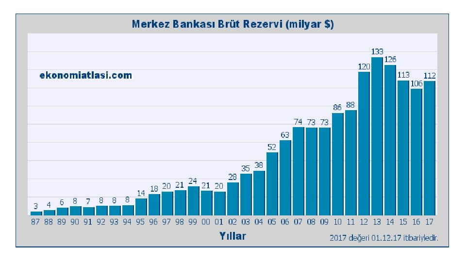 Döviz Rezervleri 2001 krizinden sonra uygulanan dalgalı kur rejimi ile Merkez Bankası hem döviz kurundaki aşırı oynaklığı önlemek için belirli aralıklarla piyasalara müdahale etmek, hem de rezerv biriktirmek amacıyla günlük döviz alım ihaleleri düzenlemeye başlamıştır. Rezervler, fiyat istikrarını sağlamak amacı güden Merkez Bankası’na para politikalarını etkin bir şekilde uygulanmasında esneklik ve hareket alanı sağlamıştır (TCMB, 2011). Türkiye Cumhuriyet Merkez Bankası (TCMB) rezervlerinde her yıl artış meydana gelmiştir. Merkez Bankası altın dâhil, döviz rezervleri 2002 yılında 28 milyar Dolar iken 2012 yılı sonu itibariyle 120 milyar Dolar’a ulaşmış Nisan 2018 itibariyle de 112, 3 milyar dolarak devam etmektedir.