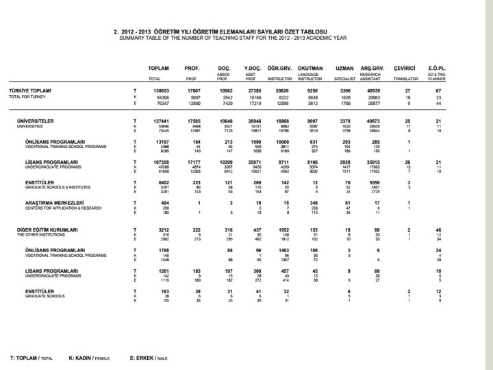 FAKÜLTELERDEKI KADIN VE ERKEK AKADEMISYEN ORANLARI Fakülteler Kadın (%) Erkek(%) İktisadi ve İdari Bilimler 40 60 Fen-Edebiyat 41 59 Hukuk 42 58 Eğitim 42 58 Tıp ve Sağlık Bilimleri 44 56 Edebiyat ve İnsani Bilimler 44 56 Müzik ve sahne Sanatları 43 57 Spor Bilimleri 46 54 Fen 46 54 Açıköğretim 48 52