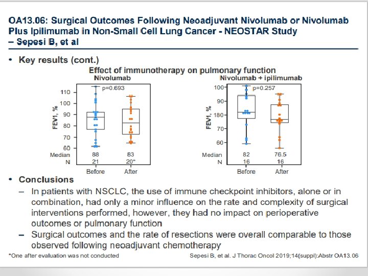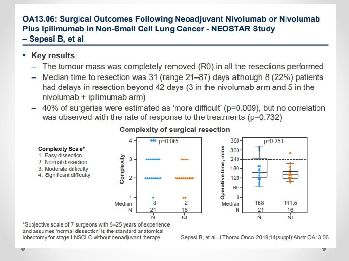 q DETERRED çalışması, faz. II q 1. KOLDA (n: 10) w. Pak-karbo- RT ile eş zamanlı Takiben 2 siklus pak-karbo-atezolizumab ve atezolizumab 1 yıl idame q 2. KOLDA (n: 30)w. Pak-karbo-ATEZO- RT ile eş zamanlı Takiben 2 siklus pak-karbo-atezolizumab ve atezolizumab 1 yıl idame q Primer sonlanım noktası güvenlik 1. kolda: %40 grade 3 artrlji, dispne, fistül 2. kolda: %23 yan etki diyare, nephrit, dispne, halsizlik ve kalp yetersizliği q İkincil sonlanım noktası PFS-OS q 1 yıllık PFS%50 , OS %79 dur. 2019 ASCO