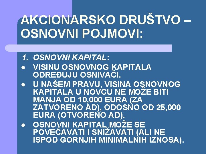 AKCIONARSKO DRUŠTVO – OSNOVNI POJMOVI: 1. OSNOVNI KAPITAL: l VISINU OSNOVNOG KAPITALA ODREĐUJU OSNIVAČI. l U NAŠEM PRAVU, VISINA OSNOVNOG KAPITALA U NOVCU NE MOŽE BITI MANJA OD 10, 000 EURA (ZA ZATVORENO AD), ODOSNO OD 25, 000 EURA (OTVORENO AD). l OSNOVNI KAPITAL MOŽE SE POVEĆAVATI I SNIŽAVATI (ALI NE ISPOD GORNJIH MINIMALNIH IZNOSA).