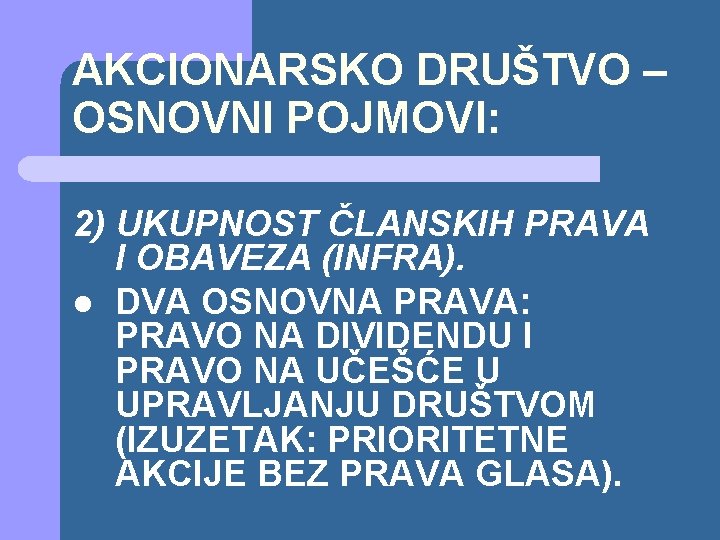 AKCIONARSKO DRUŠTVO – OSNOVNI POJMOVI: 2) UKUPNOST ČLANSKIH PRAVA I OBAVEZA (INFRA). l DVA OSNOVNA PRAVA: PRAVO NA DIVIDENDU I PRAVO NA UČEŠĆE U UPRAVLJANJU DRUŠTVOM (IZUZETAK: PRIORITETNE AKCIJE BEZ PRAVA GLASA).