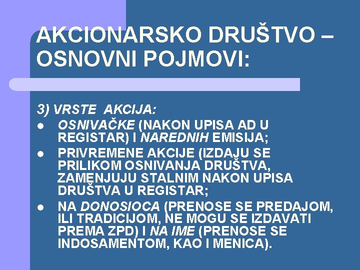 AKCIONARSKO DRUŠTVO – OSNOVNI POJMOVI: 3) VRSTE AKCIJA: l l l OSNIVAČKE (NAKON UPISA AD U REGISTAR) I NAREDNIH EMISIJA; PRIVREMENE AKCIJE (IZDAJU SE PRILIKOM OSNIVANJA DRUŠTVA, ZAMENJUJU STALNIM NAKON UPISA DRUŠTVA U REGISTAR; NA DONOSIOCA (PRENOSE SE PREDAJOM, ILI TRADICIJOM, NE MOGU SE IZDAVATI PREMA ZPD) I NA IME (PRENOSE SE INDOSAMENTOM, KAO I MENICA).