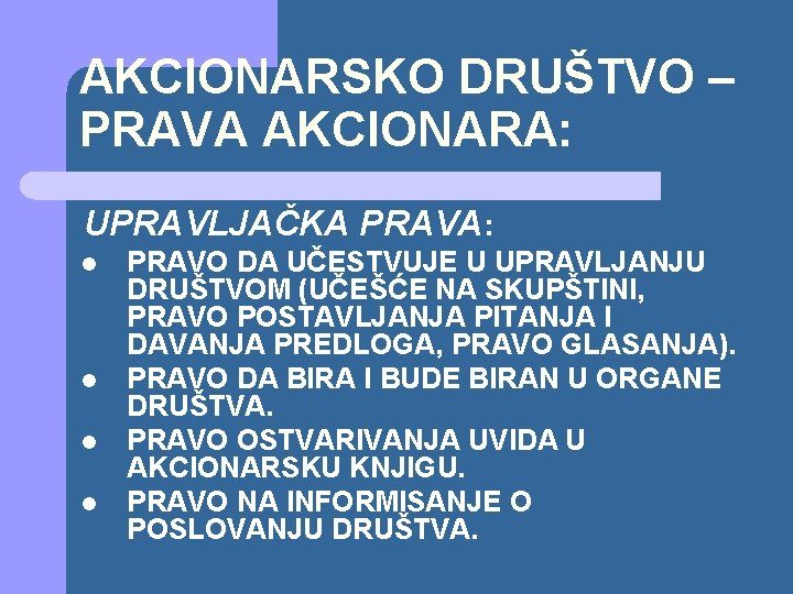 AKCIONARSKO DRUŠTVO – PRAVA AKCIONARA: UPRAVLJAČKA PRAVA: l l PRAVO DA UČESTVUJE U UPRAVLJANJU DRUŠTVOM (UČEŠĆE NA SKUPŠTINI, PRAVO POSTAVLJANJA PITANJA I DAVANJA PREDLOGA, PRAVO GLASANJA). PRAVO DA BIRA I BUDE BIRAN U ORGANE DRUŠTVA. PRAVO OSTVARIVANJA UVIDA U AKCIONARSKU KNJIGU. PRAVO NA INFORMISANJE O POSLOVANJU DRUŠTVA.