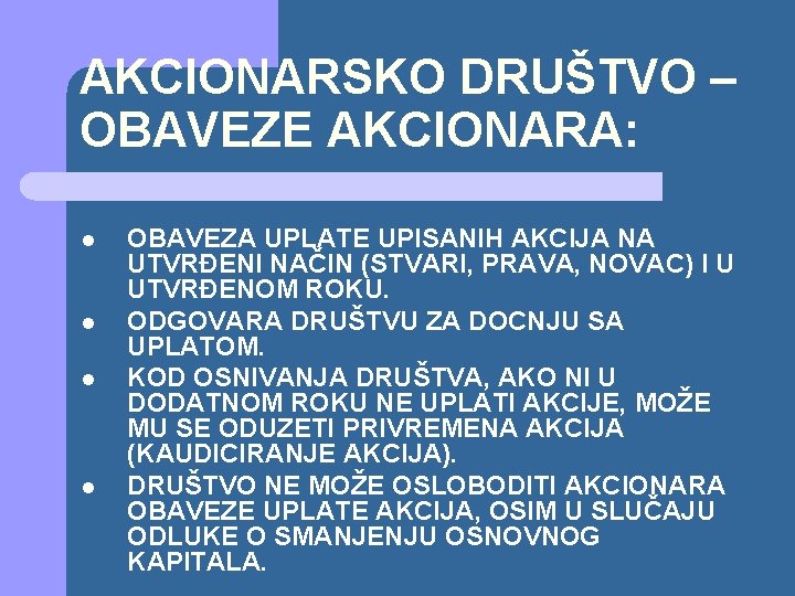 AKCIONARSKO DRUŠTVO – OBAVEZE AKCIONARA: l l OBAVEZA UPLATE UPISANIH AKCIJA NA UTVRĐENI NAČIN (STVARI, PRAVA, NOVAC) I U UTVRĐENOM ROKU. ODGOVARA DRUŠTVU ZA DOCNJU SA UPLATOM. KOD OSNIVANJA DRUŠTVA, AKO NI U DODATNOM ROKU NE UPLATI AKCIJE, MOŽE MU SE ODUZETI PRIVREMENA AKCIJA (KAUDICIRANJE AKCIJA). DRUŠTVO NE MOŽE OSLOBODITI AKCIONARA OBAVEZE UPLATE AKCIJA, OSIM U SLUČAJU ODLUKE O SMANJENJU OSNOVNOG KAPITALA.
