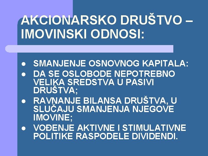 AKCIONARSKO DRUŠTVO – IMOVINSKI ODNOSI: l l SMANJENJE OSNOVNOG KAPITALA: DA SE OSLOBODE NEPOTREBNO VELIKA SREDSTVA U PASIVI DRUŠTVA; RAVNANJE BILANSA DRUŠTVA, U SLUČAJU SMANJENJA NJEGOVE IMOVINE; VOĐENJE AKTIVNE I STIMULATIVNE POLITIKE RASPODELE DIVIDENDI.