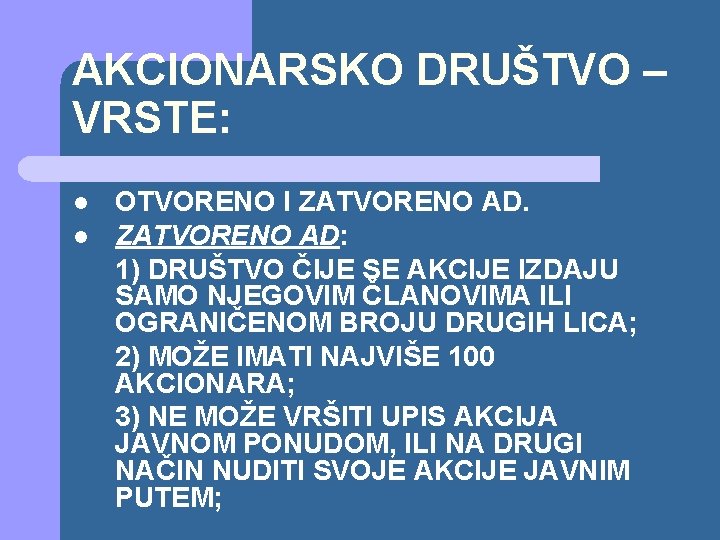 AKCIONARSKO DRUŠTVO – VRSTE: l l OTVORENO I ZATVORENO AD: 1) DRUŠTVO ČIJE SE AKCIJE IZDAJU SAMO NJEGOVIM ČLANOVIMA ILI OGRANIČENOM BROJU DRUGIH LICA; 2) MOŽE IMATI NAJVIŠE 100 AKCIONARA; 3) NE MOŽE VRŠITI UPIS AKCIJA JAVNOM PONUDOM, ILI NA DRUGI NAČIN NUDITI SVOJE AKCIJE JAVNIM PUTEM;