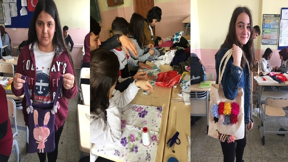 Workshop 5 (Making cloth bags using waste clothes) We designed another art and design workshop with our students. Our Literature teacher Hilal Serbes prepared a workshop to teach ss how to make cloth bags using waste materials. In this workshop both students had chance to make sth renewable using their skills and hand craft both they learnt how waste materials are used in many ways. We first started a month long campaign to collect waste clothes around the school and we had a very big storage. Later on we chose the clothes which could be renewable and sorted out them to sew bags and other things. Plus, we picked some cloth to make yarn. We started make yarn with ours students and had a carpet loom. Our aim is to weave rug/carpet using these yarns. Carpet weaving is a traditional handcraft in Turkey. It is our historical and cultural heritage. For this reason our literature teacher prepared a small presentation about the history of weaving carpet in Anatolia. We watched some videos and started the task. In this task, other colleagues and students also have contributed the task.