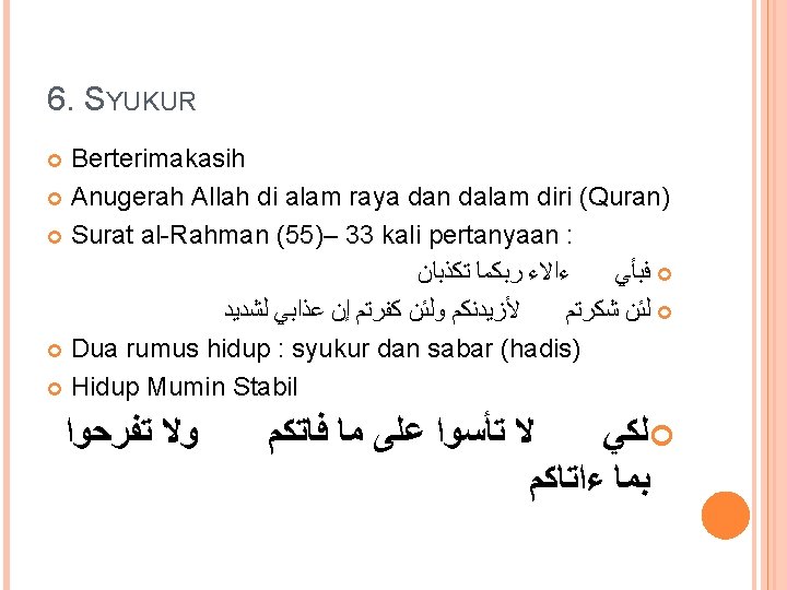 3. IKHLAS Etimologis : jernih bersih Terminologis : jernihnya suatu amal dari segala kotoran (Ibnu Qayyim al-Jauziyah) ﺗﺼﻔﻴﺔ ﺍﻟﻌﻤﻞ ﻣﻦ ﻛﻞ ﺷﻮﺏ