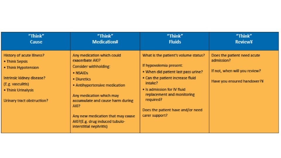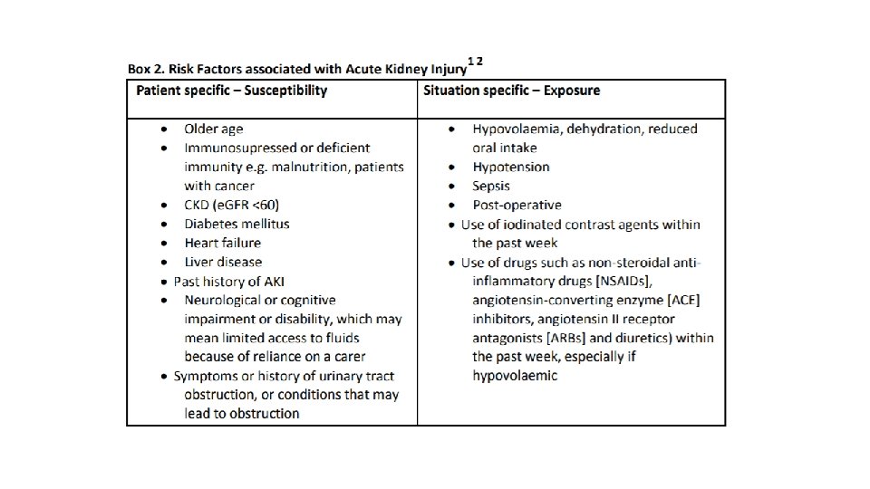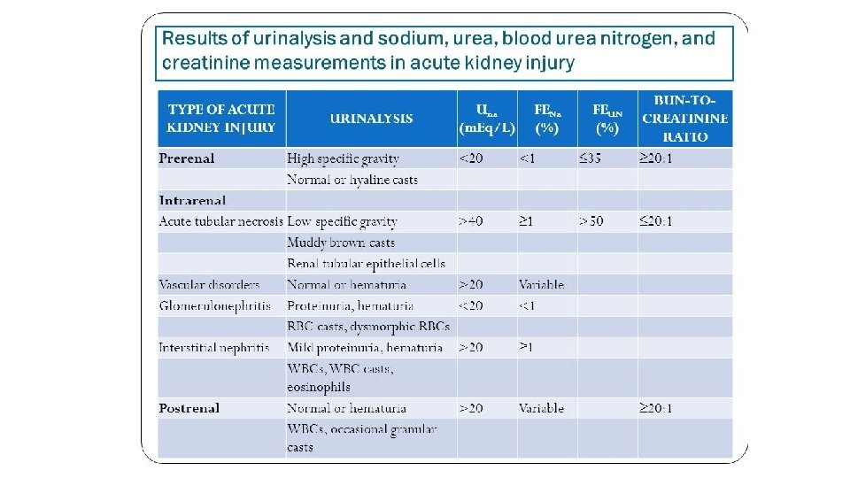 Etiology • prerenal causes decreased renal perfusion (e. g. , hemorrhage, congestive heart failure, and diuretic use , gastroenteritis …. etc. ) ( most common cause in outpatient settings ) • intrarenal causes acute tubular necrosis ( most common intra renal cause , and most common cause of AKI in hospitalized patients ) ischemia and toxic causes interstitial nephritis glomerulonephritis vasculitis hemolytic uremic syndrome cholesterol emboli ……………. . etc. . • postrenal causes urinary flow obstruction (e. g. , benign prostatic hyperplasia and nephrolithiasis) post-operative secondary to bladder manipulation and anesthesia , bladder scans should be performed followed by urinary catheterization