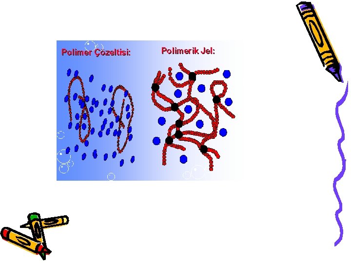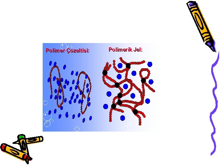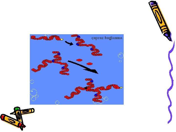 Dallanma arttıkça çözünürlük ? ? ? ? • Dallanmanın olması polimerin çözünürlüğünü düşürür • Çapraz bağlı yapılarsa çözünmeyip çözücüyü emerek şişerler. • Eğer çapraz bağlı polimerler su ortamında şişerse buna jel ya da hidrojel denir.