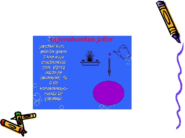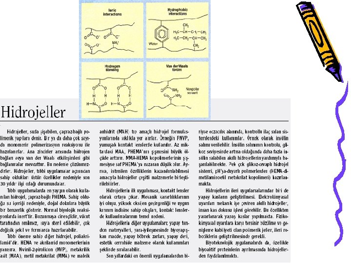 Ve özellikle…. • Araştırmacılar spesifik ilaç salım problemlerini çözebilecek materyaller dizayn etme çabası içerisindedirler • Elektrokimyasal uyarıları mekanik işe çeviren akıllı hidrojeller insan kas dokusu işlevi görebilir. Bu özellikle yararlanarak yapay kaslar yapılmaktadır. • Biyoteknolojide özellikle biyoaktif proteinlerin ayrılmasında hidrojellerden faydalanılmaktadır.