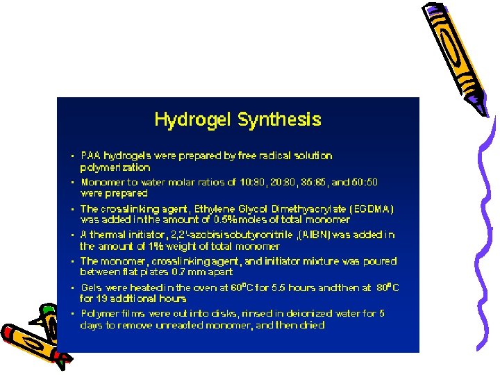 Kısaca………. . • Hopolimer hidrojel : Tek bir hidrofilik monomerin çapraz bağlanmasıyla oluşmuş yapılar • Kopolimer Hidrojel : İki monomerin çapraz bağlanmasıyla oluşur. Ancak monomerden biri hidrofilik yapıda olması gerekir. • Çoklu Polimer Hidrojelleri: İki yada daha fazla sayıda komonomerin reaksiyonu ile oluşur • IPN hidrojeller : Çapraz bağlı iki polimerik örgünün fiziksel olarak birleşmesiyle oluşur. Örneğin polioksietilen ve poli akrilik asit ten hazırlanan IPN yapılar mevcuttur. Önce çapraz bağlı polioksietilen hazırlanır sonra bu örgü akrilik asit, başlatıcı ve çapraz bağlayıcı içeren karışımda şişirilirken polimerizasyon olur.