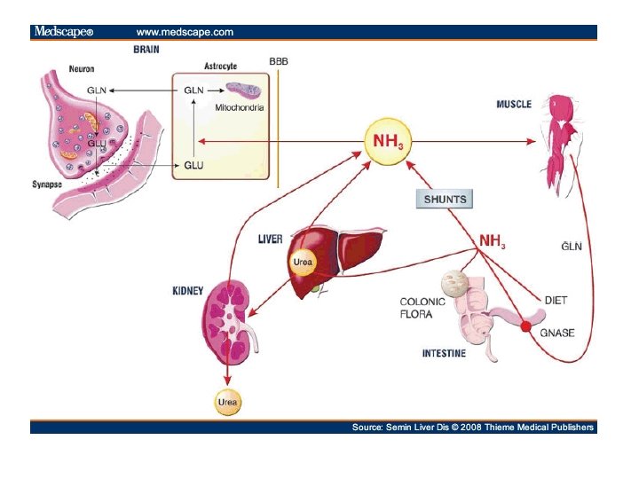 Amonija izcelsme • GI asiņošana • Azotēmija • Pastiprināta proteīnu uzņemšana • Aizcietējumi Pastiprināta amonija veidošanās zarnās Zarnas Kunģis/zarnas • Audu asiņošana • Infekcija, sepse • katabolisms, muskuļu atrofija • Azotēmija Ekstraintestināla veidošanās Nieres Muskuļi Hiperamonēmija AE • Aknu M/f zudums • Portokavāli šunti • Metabola nepietiekamība • Acidoze • Diurētiķi Samazināta detoksikācija Aknas Muskuļi
