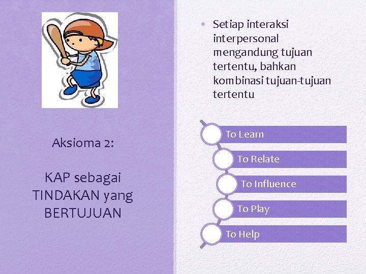 • Setiap interaksi interpersonal mengandung tujuan tertentu, bahkan kombinasi tujuan-tujuan tertentu Aksioma 2: To Learn To Relate KAP sebagai TINDAKAN yang BERTUJUAN To Influence To Play To Help