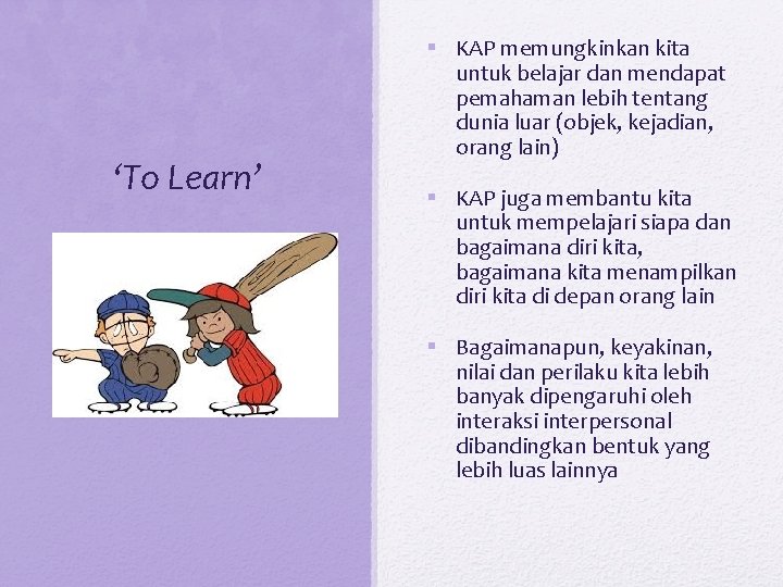 ‘To Learn’ § KAP memungkinkan kita untuk belajar dan mendapat pemahaman lebih tentang dunia luar (objek, kejadian, orang lain) § KAP juga membantu kita untuk mempelajari siapa dan bagaimana diri kita, bagaimana kita menampilkan diri kita di depan orang lain § Bagaimanapun, keyakinan, nilai dan perilaku kita lebih banyak dipengaruhi oleh interaksi interpersonal dibandingkan bentuk yang lebih luas lainnya