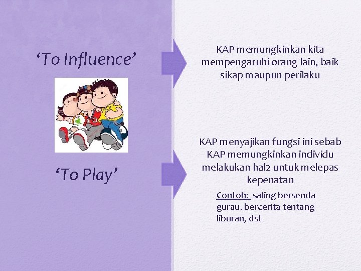 ‘To Influence’ ‘To Play’ KAP memungkinkan kita mempengaruhi orang lain, baik sikap maupun perilaku KAP menyajikan fungsi ini sebab KAP memungkinkan individu melakukan hal 2 untuk melepas kepenatan Contoh: saling bersenda gurau, bercerita tentang liburan, dst