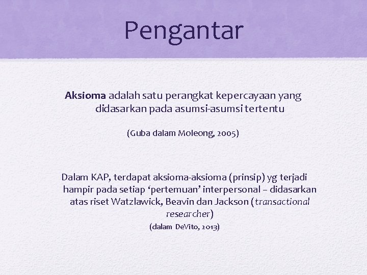 Pengantar Aksioma adalah satu perangkat kepercayaan yang didasarkan pada asumsi-asumsi tertentu (Guba dalam Moleong, 2005) Dalam KAP, terdapat aksioma-aksioma (prinsip) yg terjadi hampir pada setiap ‘pertemuan’ interpersonal – didasarkan atas riset Watzlawick, Beavin dan Jackson (transactional researcher) (dalam De. Vito, 2013)