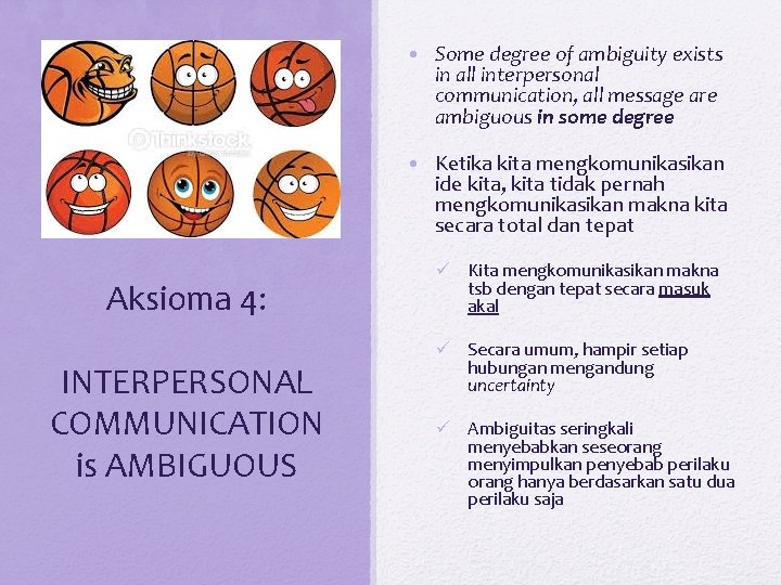 • Some degree of ambiguity exists in all interpersonal communication, all message are ambiguous in some degree • Ketika kita mengkomunikasikan ide kita, kita tidak pernah mengkomunikasikan makna kita secara total dan tepat Aksioma 4: INTERPERSONAL COMMUNICATION is AMBIGUOUS ü Kita mengkomunikasikan makna tsb dengan tepat secara masuk akal ü Secara umum, hampir setiap hubungan mengandung uncertainty ü Ambiguitas seringkali menyebabkan seseorang menyimpulkan penyebab perilaku orang hanya berdasarkan satu dua perilaku saja