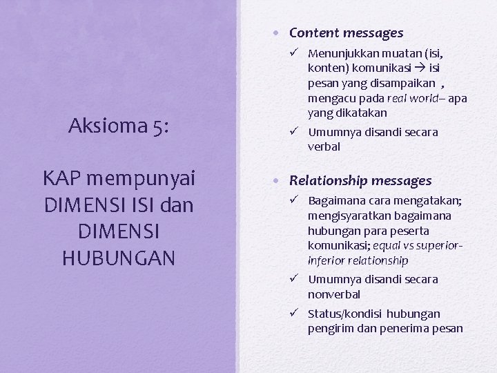 • Content messages Aksioma 5: KAP mempunyai DIMENSI ISI dan DIMENSI HUBUNGAN ü Menunjukkan muatan (isi, konten) komunikasi isi pesan yang disampaikan , mengacu pada real world– apa yang dikatakan ü Umumnya disandi secara verbal • Relationship messages ü Bagaimana cara mengatakan; mengisyaratkan bagaimana hubungan para peserta komunikasi; equal vs superiorinferior relationship ü Umumnya disandi secara nonverbal ü Status/kondisi hubungan pengirim dan penerima pesan