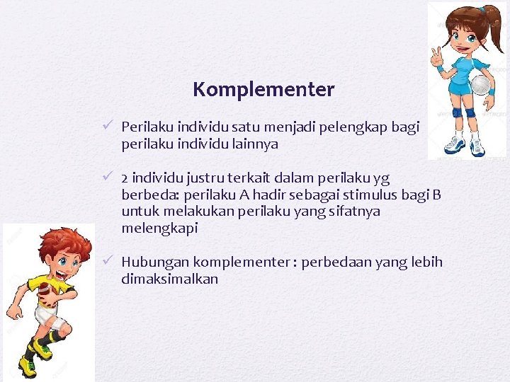 Komplementer ü Perilaku individu satu menjadi pelengkap bagi perilaku individu lainnya ü 2 individu justru terkait dalam perilaku yg berbeda: perilaku A hadir sebagai stimulus bagi B untuk melakukan perilaku yang sifatnya melengkapi ü Hubungan komplementer : perbedaan yang lebih dimaksimalkan