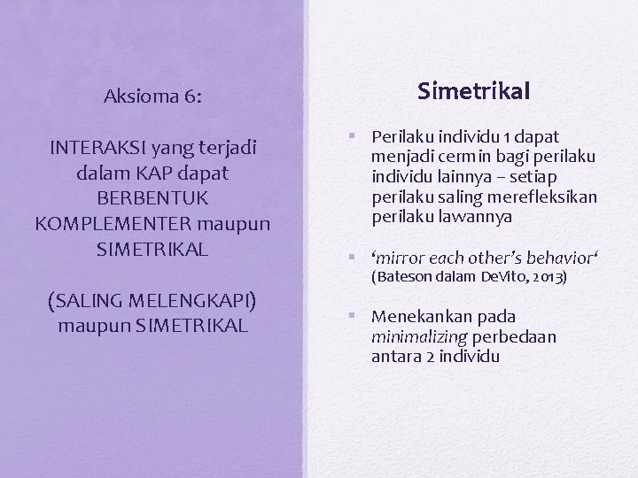 Aksioma 6: Simetrikal INTERAKSI yang terjadi dalam KAP dapat BERBENTUK KOMPLEMENTER maupun SIMETRIKAL § Perilaku individu 1 dapat menjadi cermin bagi perilaku individu lainnya – setiap perilaku saling merefleksikan perilaku lawannya § ‘mirror each other’s behavior‘ (Bateson dalam De. Vito, 2013) (SALING MELENGKAPI) maupun SIMETRIKAL § Menekankan pada minimalizing perbedaan antara 2 individu