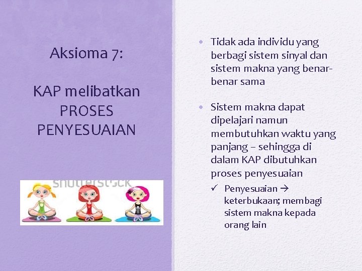 Aksioma 7: KAP melibatkan PROSES PENYESUAIAN • Tidak ada individu yang berbagi sistem sinyal dan sistem makna yang benar sama • Sistem makna dapat dipelajari namun membutuhkan waktu yang panjang – sehingga di dalam KAP dibutuhkan proses penyesuaian ü Penyesuaian keterbukaan; membagi sistem makna kepada orang lain